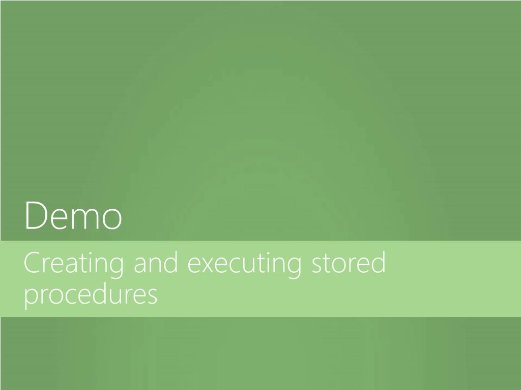 Executing system stored procedures • System stored procedures: • Marked with an sp_ prefix • Stored in a hidden resource database • Logically appear in the sys schema of every user and system database • Best practices for execution include: • Always use EXEC or EXECUTE rather than just calling by name • Include the sys schema name when executing • Name each parameter and specify its appropriate data type --This example uses EXEC, includes the sys schema name, --and passes the table name as a named Unicode parameter --to a procedure accepting an NVARCHAR(776) --input parameter. EXECsys.sp_help@objname =N'Sales.Customer';