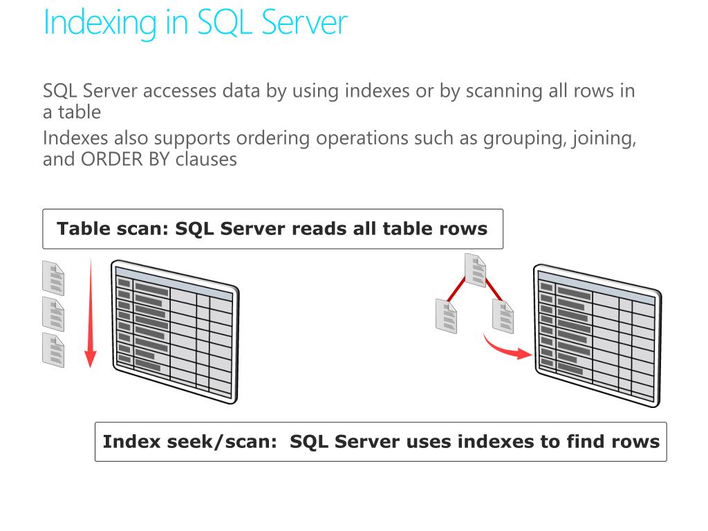 Indexing in SQL Server • SQL Server accesses data by using indexes or by scanning all rows in a table • Indexes also supports ordering operations such as grouping, joining, and ORDER BY clauses Table scan: SQL Server reads all table rows Index seek/scan: SQL Server uses indexes to find rows