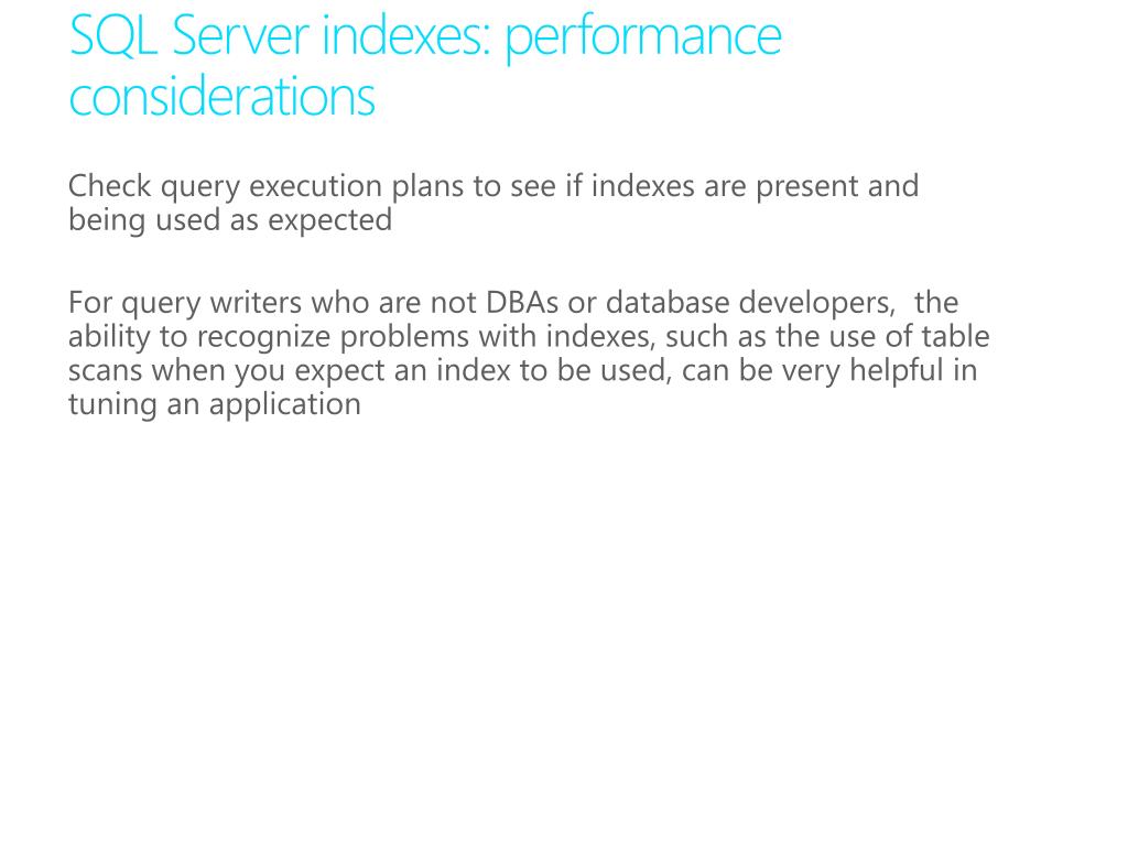 SQL Server indexes: performance considerations • Check query execution plans to see if indexes are present and being used as expected • For query writers who are not DBAs or database developers, the ability to recognize problems with indexes, such as the use of table scans when you expect an index to be used, can be very helpful in tuning an application