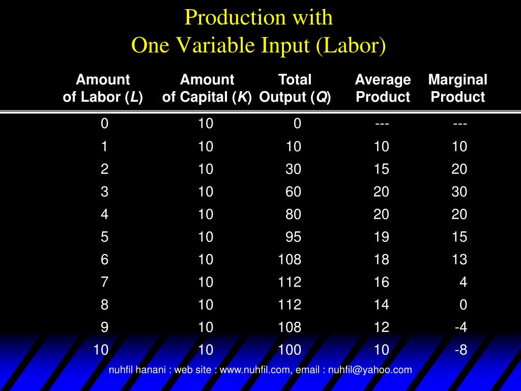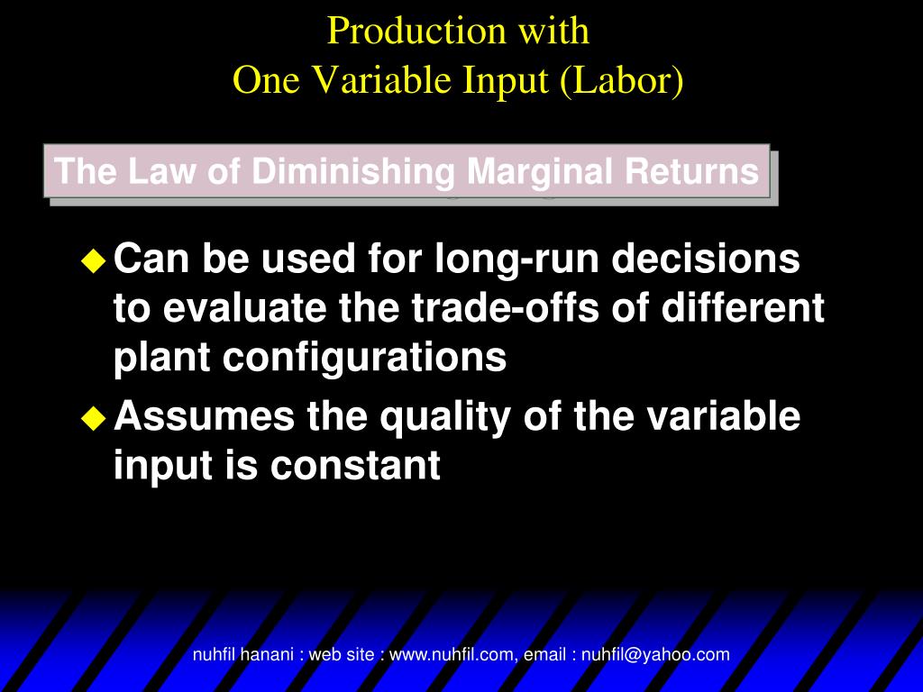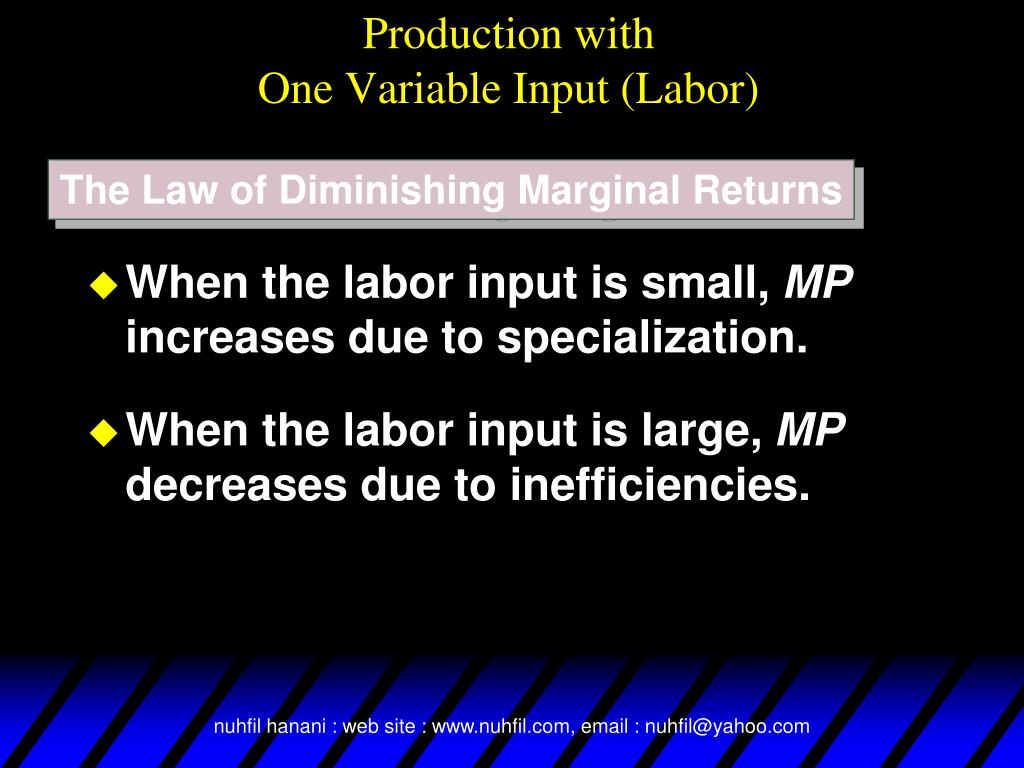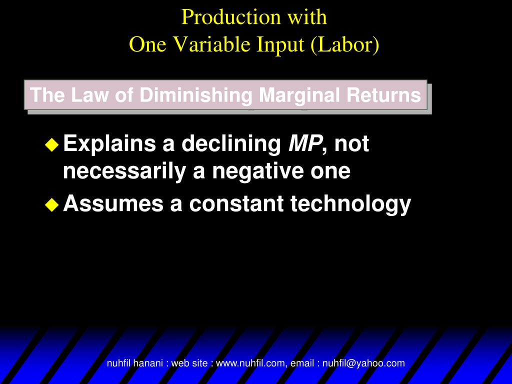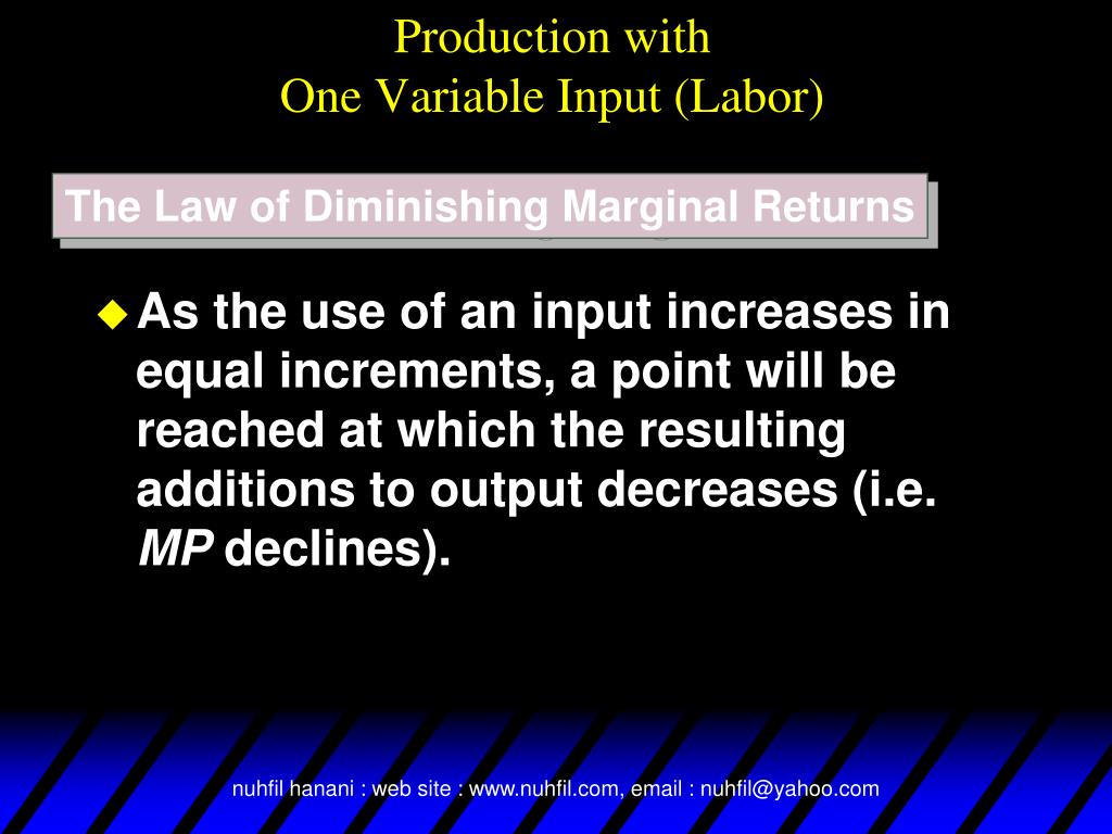Production withOne Variable Input (Labor) The Law of Diminishing Marginal Returns • As the use of an input increases in equal increments, a point will be reached at which the resulting additions to output decreases (i.e. MP declines). nuhfil hanani : web site : www.nuhfil.com, email : nuhfil@yahoo.com