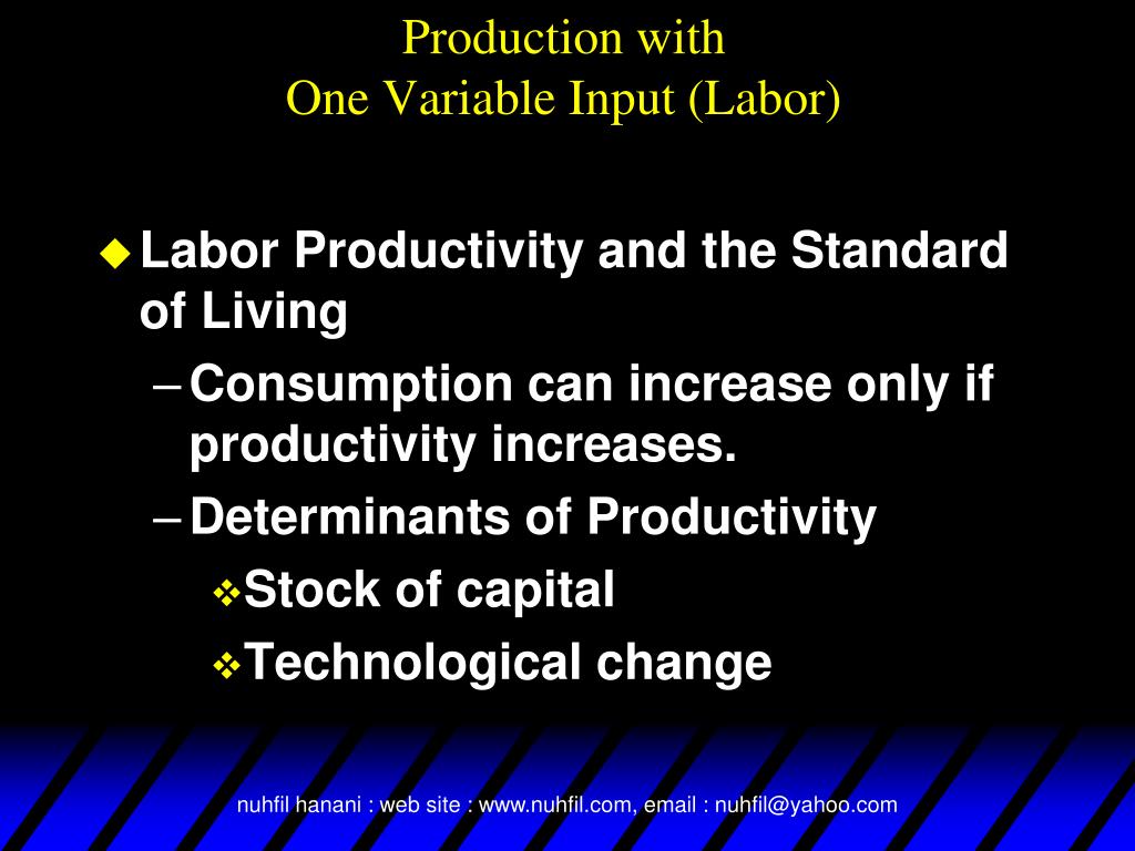 Production withOne Variable Input (Labor) • Labor Productivity and the Standard of Living • Consumption can increase only if productivity increases. • Determinants of Productivity • Stock of capital • Technological change nuhfil hanani : web site : www.nuhfil.com, email : nuhfil@yahoo.com