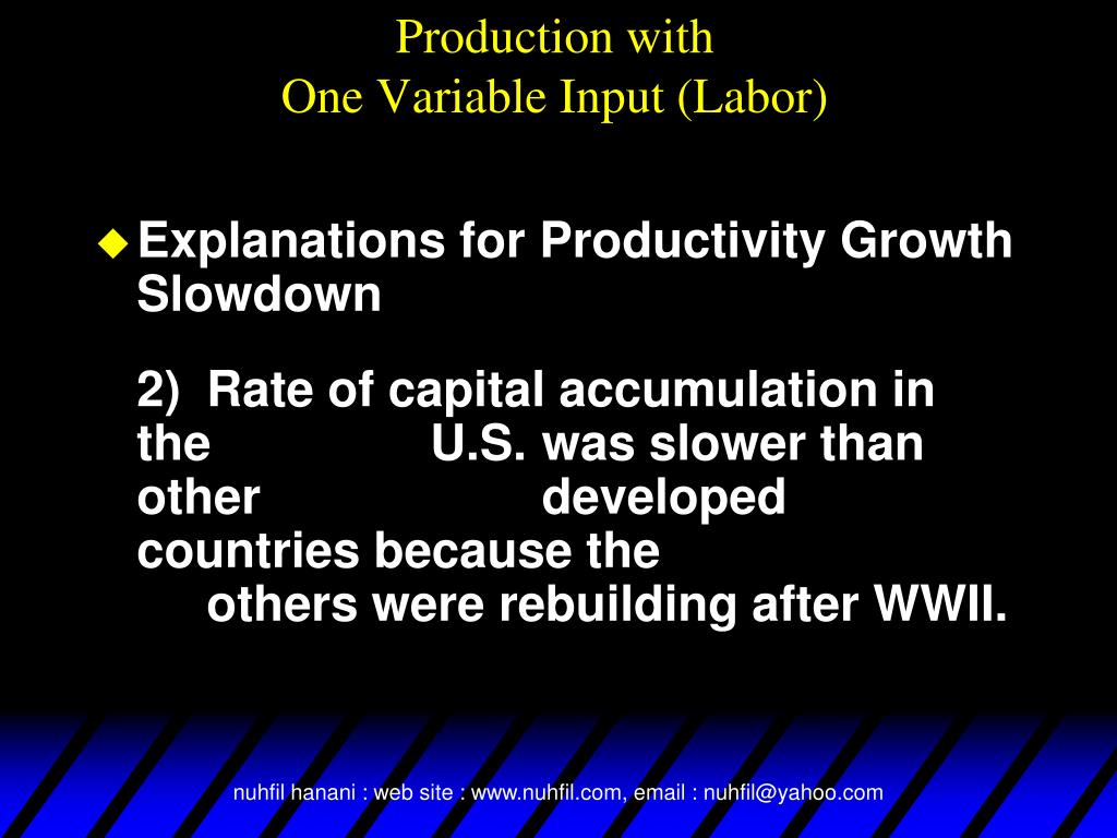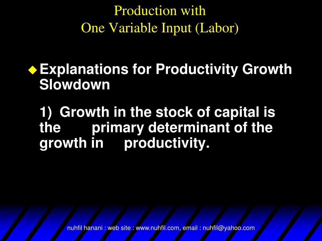Production withOne Variable Input (Labor) • Explanations for Productivity Growth Slowdown 1) Growth in the stock of capital is the primary determinant of the growth in productivity. nuhfil hanani : web site : www.nuhfil.com, email : nuhfil@yahoo.com