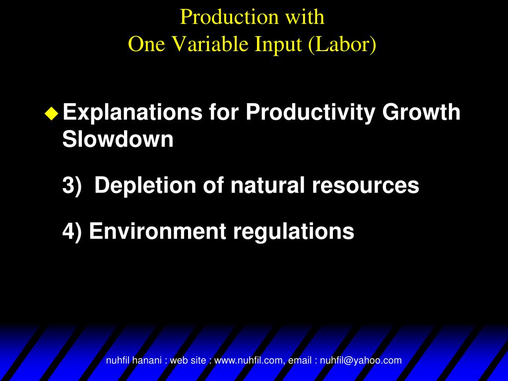 Production withOne Variable Input (Labor) • Explanations for Productivity Growth Slowdown 3) Depletion of natural resources 4) Environment regulations nuhfil hanani : web site : www.nuhfil.com, email : nuhfil@yahoo.com