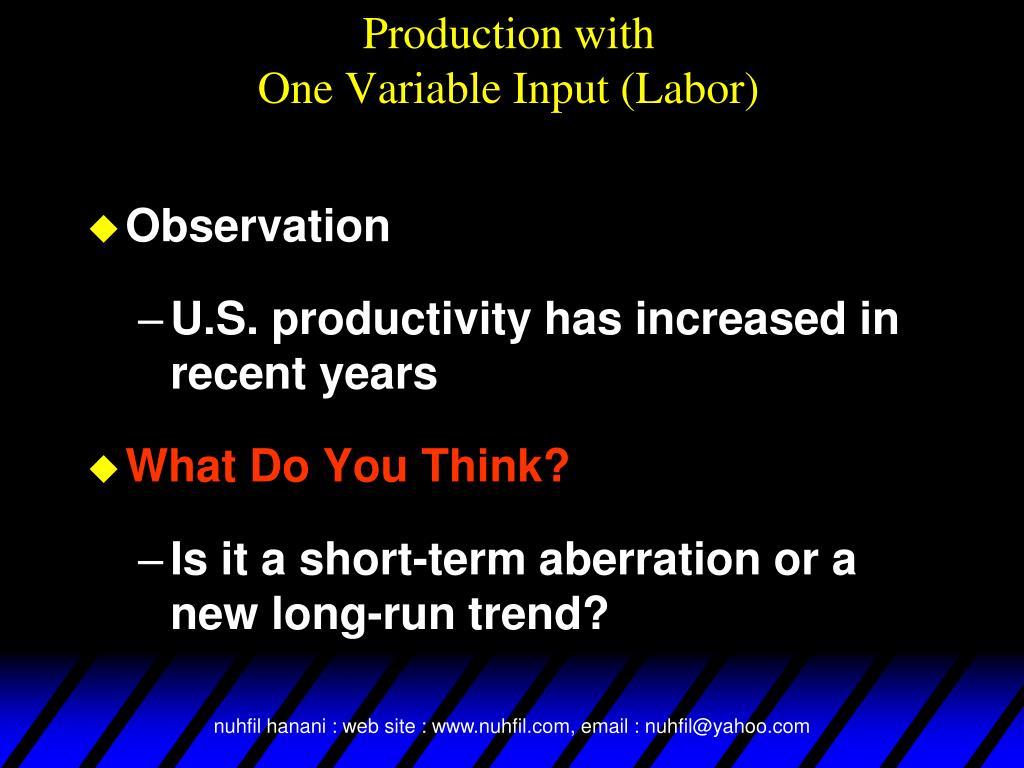 Production withOne Variable Input (Labor) • Observation • U.S. productivity has increased in recent years • What Do You Think? • Is it a short-term aberration or a new long-run trend? nuhfil hanani : web site : www.nuhfil.com, email : nuhfil@yahoo.com