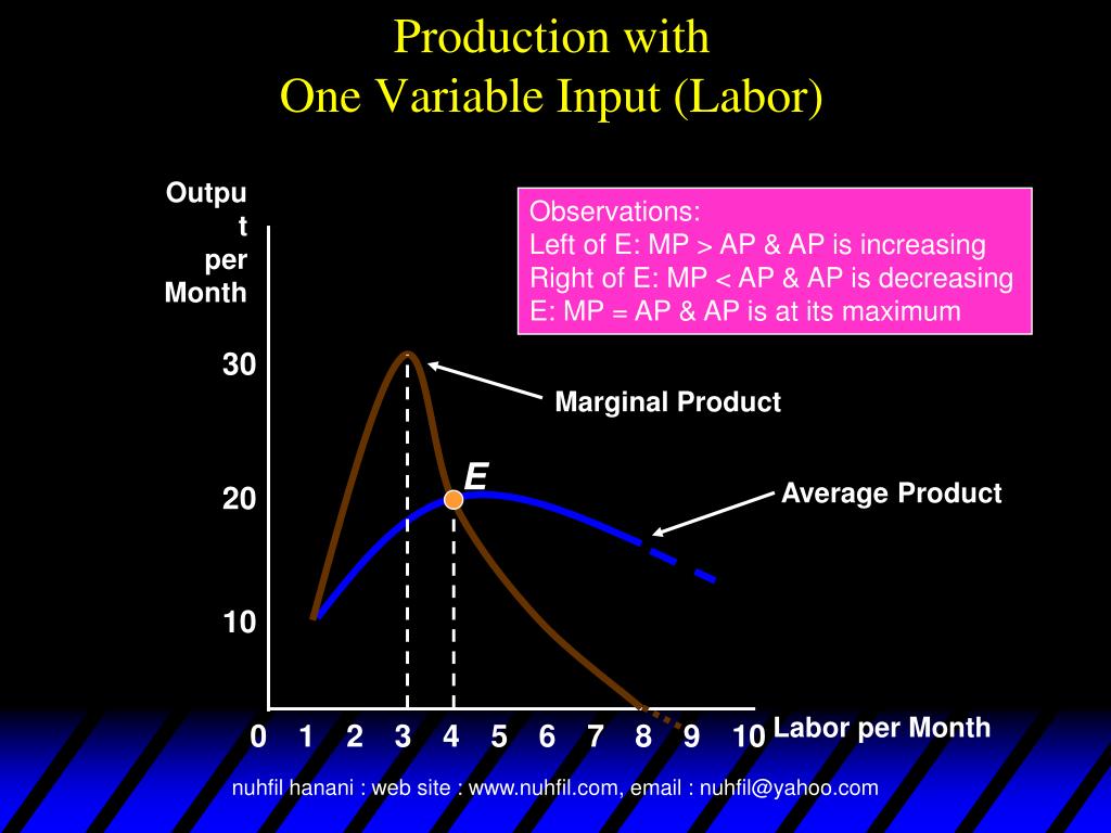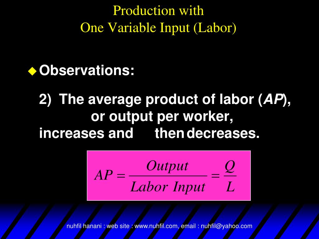 Production withOne Variable Input (Labor) • Observations: 2) The average product of labor (AP), or output per worker, increases and then decreases. nuhfil hanani : web site : www.nuhfil.com, email : nuhfil@yahoo.com