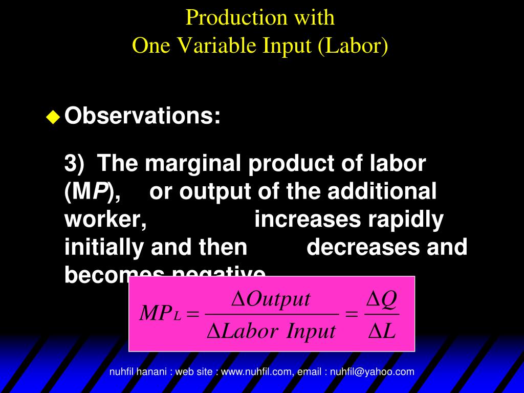 Production withOne Variable Input (Labor) • Observations: 3) The marginal product of labor (MP), or output of the additional worker, increases rapidly initially and then decreases and becomes negative.. nuhfil hanani : web site : www.nuhfil.com, email : nuhfil@yahoo.com