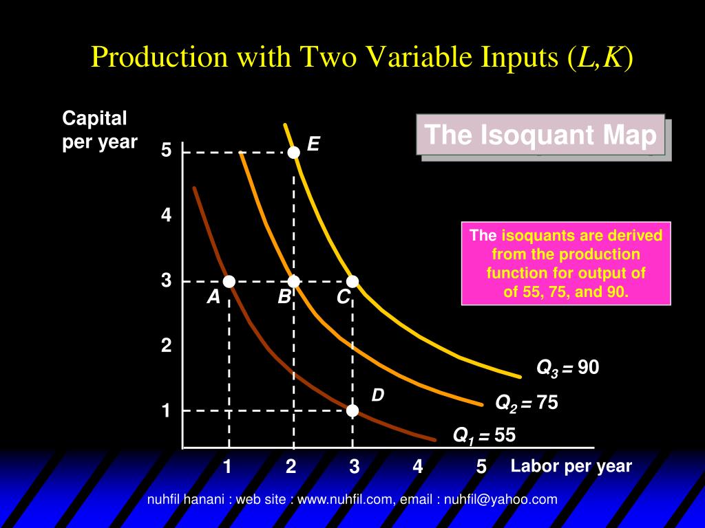 Production with Two Variable Inputs (L,K) Capital per year The Isoquant Map E 5 4 The isoquants are derived from the production function for output of of 55, 75, and 90. 3 A B C 2 Q3 = 90 D Q2 = 75 1 Q1 = 55 1 2 3 4 5 Labor per year nuhfil hanani : web site : www.nuhfil.com, email : nuhfil@yahoo.com