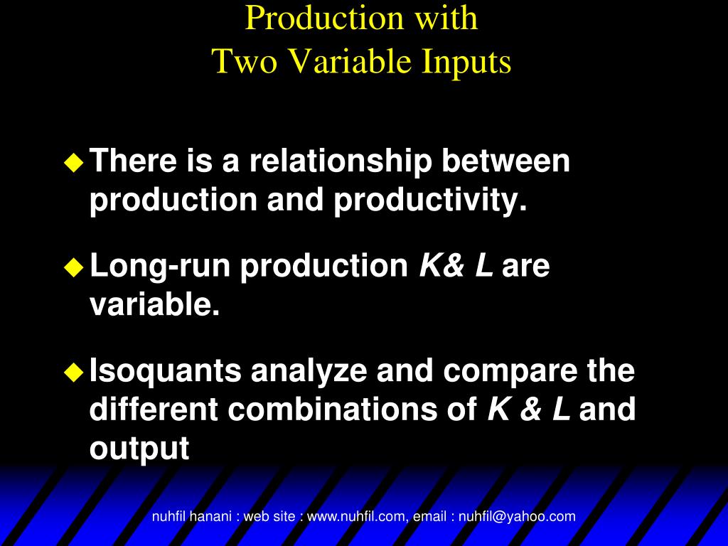 Production withTwo Variable Inputs • There is a relationship between production and productivity. • Long-run production K& L are variable. • Isoquants analyze and compare the different combinations of K & L and output nuhfil hanani : web site : www.nuhfil.com, email : nuhfil@yahoo.com