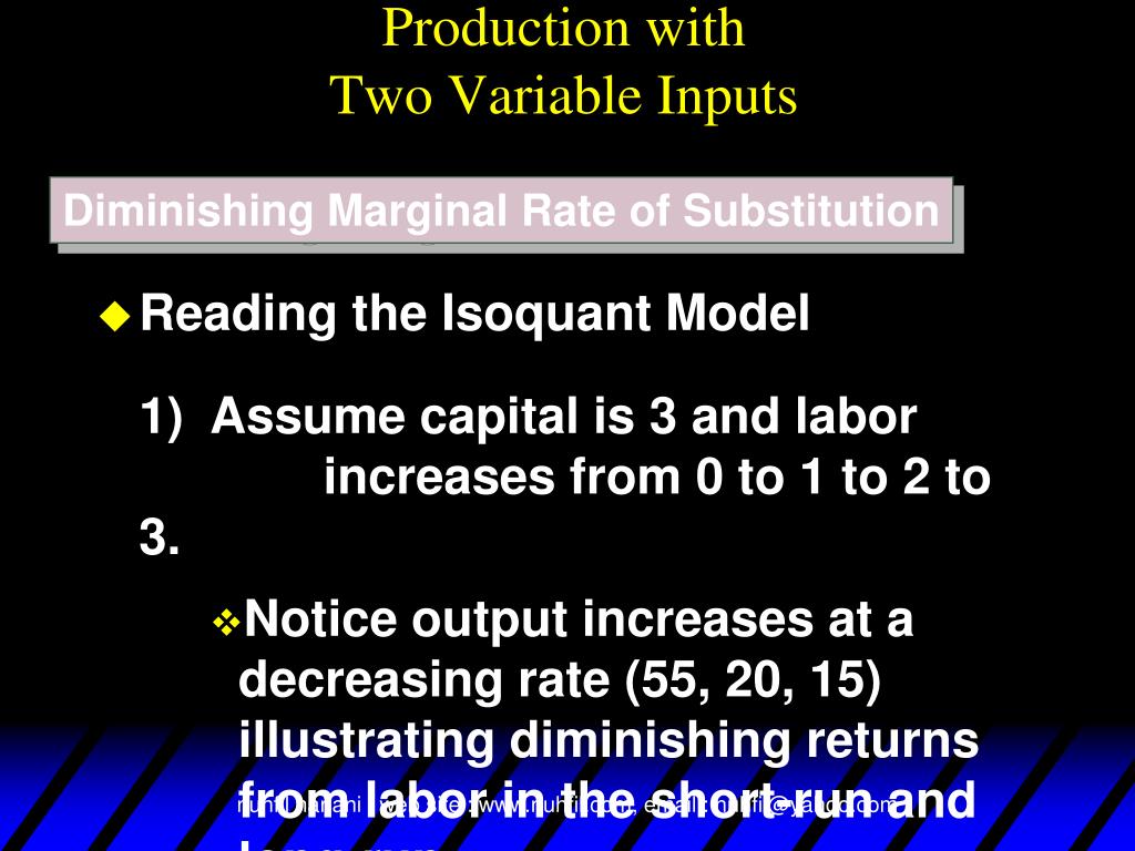 Production withTwo Variable Inputs Diminishing Marginal Rate of Substitution • Reading the Isoquant Model 1) Assume capital is 3 and labor increases from 0 to 1 to 2 to 3. • Notice output increases at a decreasing rate (55, 20, 15) illustrating diminishing returns from labor in the short-run and long-run. nuhfil hanani : web site : www.nuhfil.com, email : nuhfil@yahoo.com