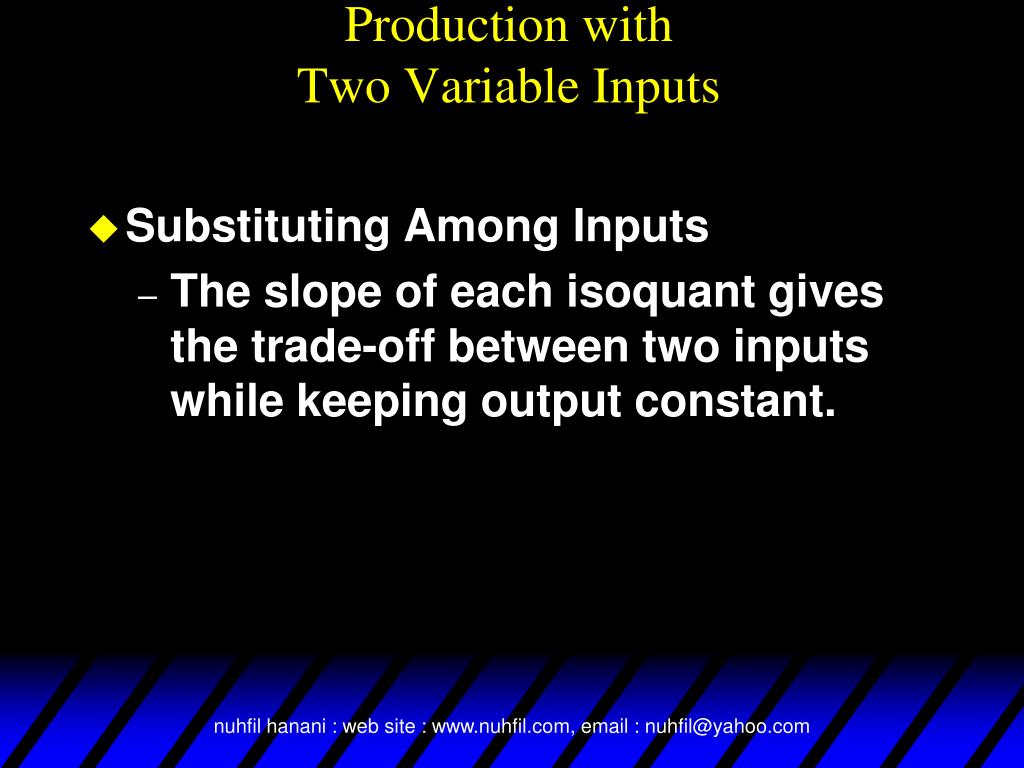 Production withTwo Variable Inputs • Substituting Among Inputs • The slope of each isoquant gives the trade-off between two inputs while keeping output constant. nuhfil hanani : web site : www.nuhfil.com, email : nuhfil@yahoo.com