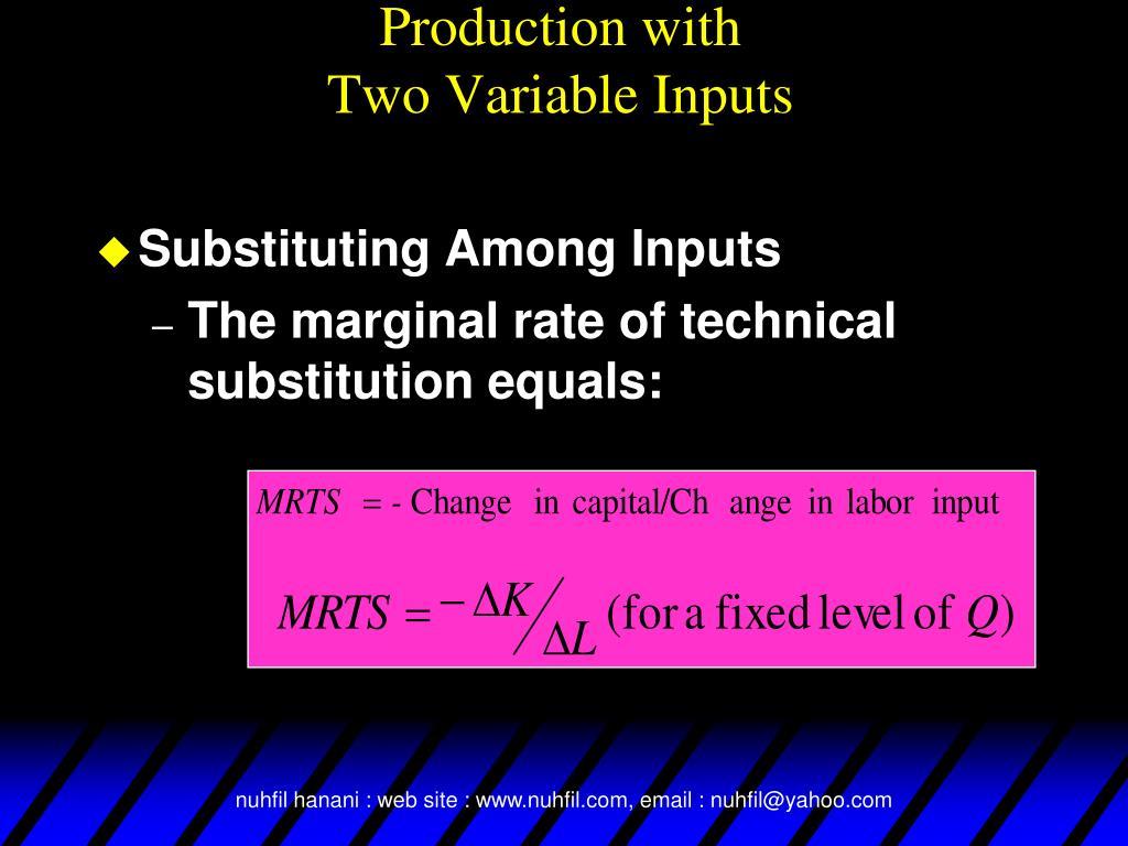 Production withTwo Variable Inputs • Substituting Among Inputs • The marginal rate of technical substitution equals: nuhfil hanani : web site : www.nuhfil.com, email : nuhfil@yahoo.com