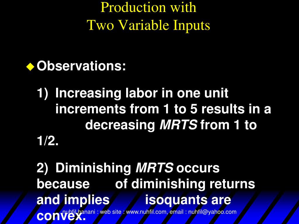 Production withTwo Variable Inputs • Observations: 1) Increasing labor in one unit increments from 1 to 5 results in a decreasing MRTS from 1 to 1/2. 2) Diminishing MRTS occurs because of diminishing returns and implies isoquants are convex. nuhfil hanani : web site : www.nuhfil.com, email : nuhfil@yahoo.com