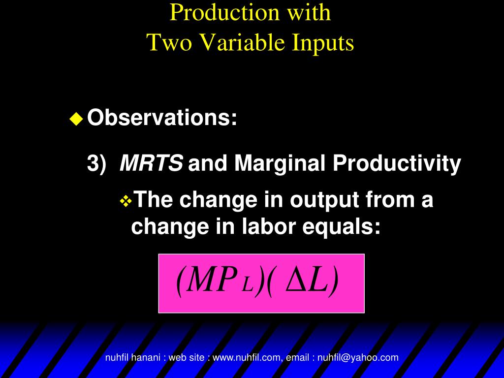 Production withTwo Variable Inputs • Observations: 3) MRTS and Marginal Productivity • The change in output from a change in labor equals: nuhfil hanani : web site : www.nuhfil.com, email : nuhfil@yahoo.com
