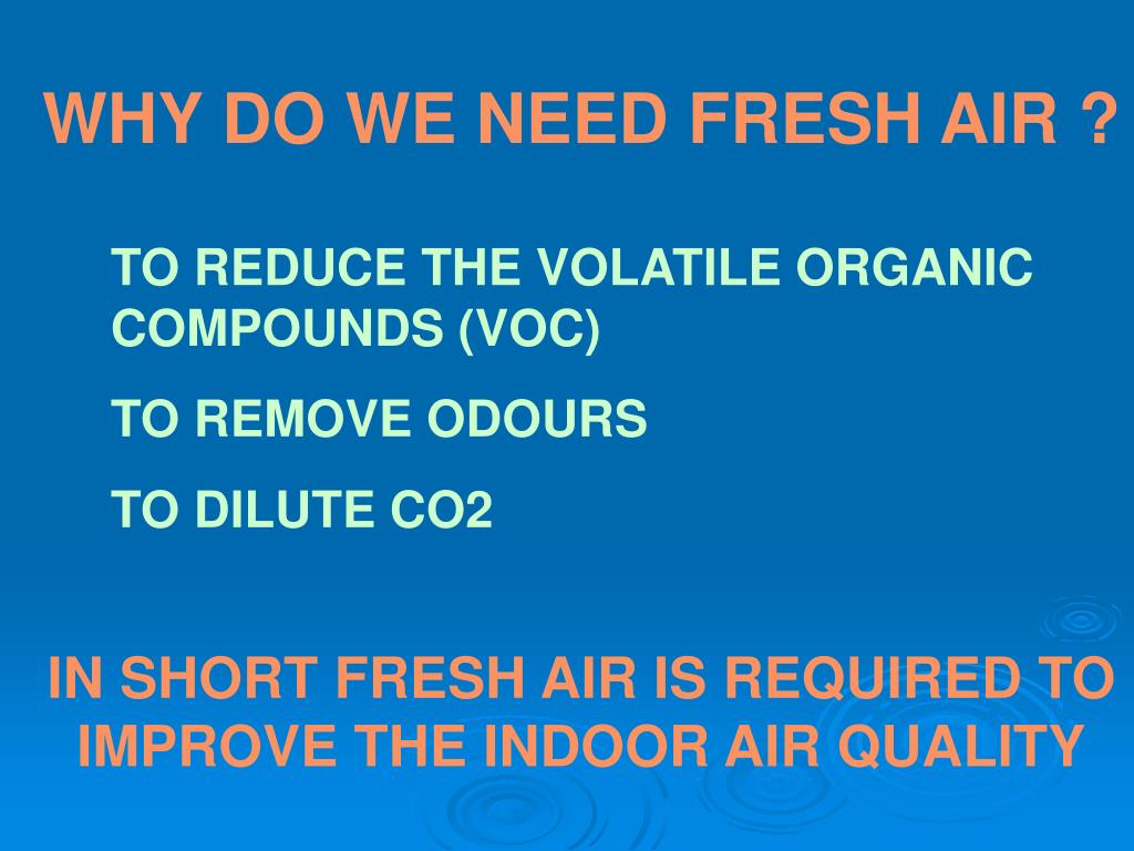 WHY DO WE NEED FRESH AIR ? • TO REDUCE THE VOLATILE ORGANIC COMPOUNDS (VOC) • TO REMOVE ODOURS • TO DILUTE CO2 IN SHORT FRESH AIR IS REQUIRED TO IMPROVE THE INDOOR AIR QUALITY
