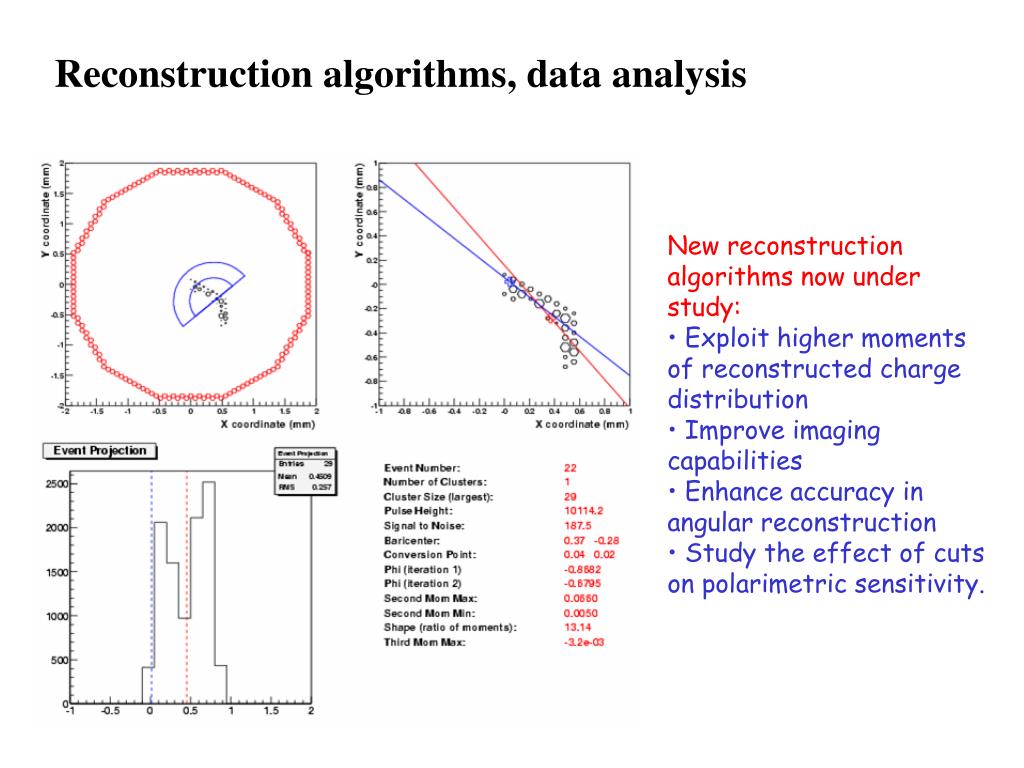 Reconstruction algorithms, data analysis • New reconstruction algorithms now under study: • Exploit higher moments of reconstructed charge distribution • Improve imaging capabilities • Enhance accuracy in angular reconstruction • Study the effect of cuts on polarimetric sensitivity.