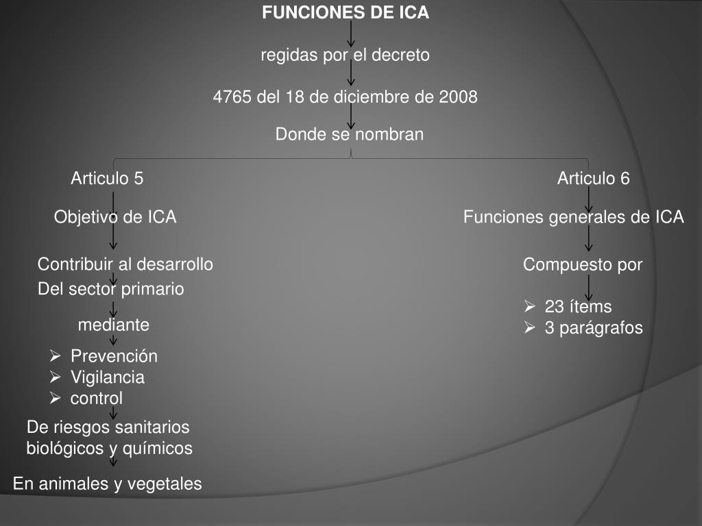 FUNCIONES DE ICA regidas por el decreto 4765 del 18 de diciembre de 2008 Donde se nombran Articulo 5 Articulo 6 Funciones generales de ICA Objetivo de ICA • Compuesto por • 23 ítems • 3 parágrafos Contribuir al desarrollo Del sector primario mediante • Prevención • Vigilancia • control De riesgos sanitarios biológicos y químicos En animales y vegetales