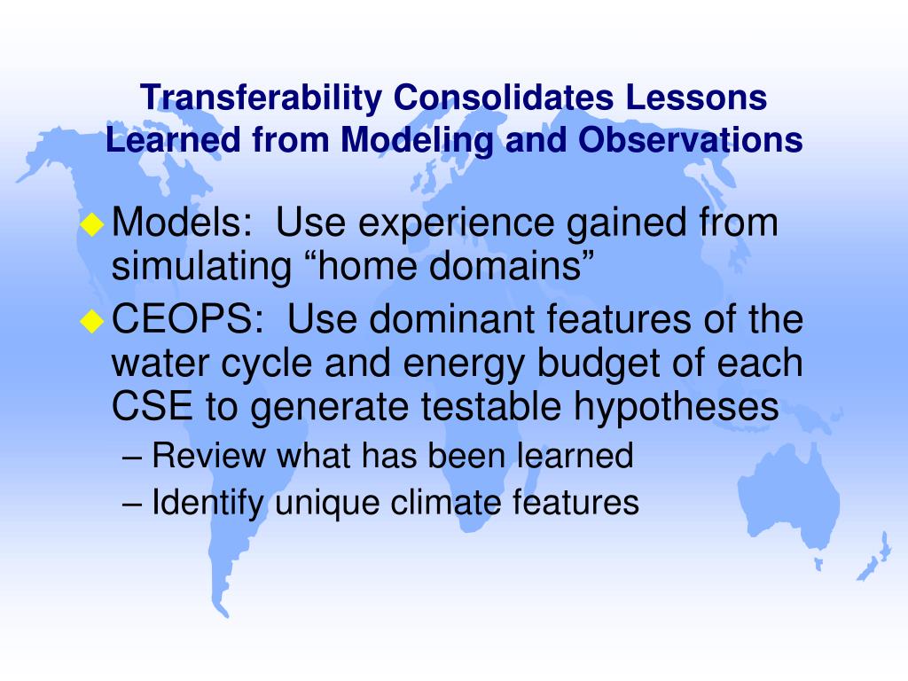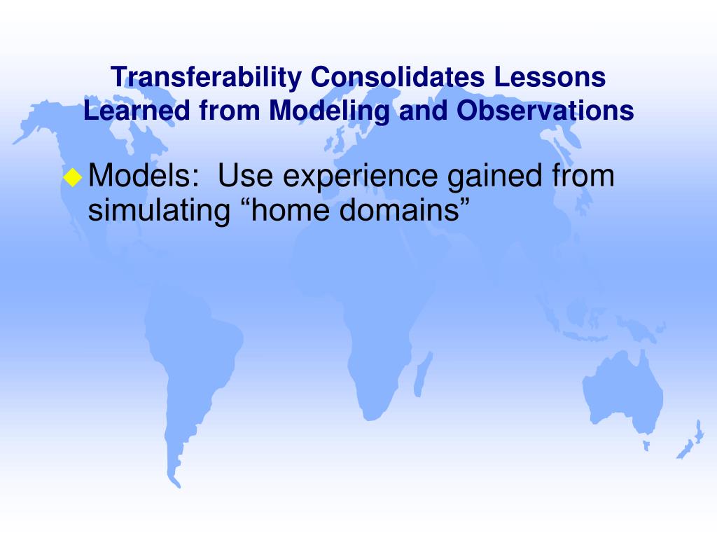 Transferability Consolidates Lessons Learned from Modeling and Observations • Models: Use experience gained from simulating “home domains”
