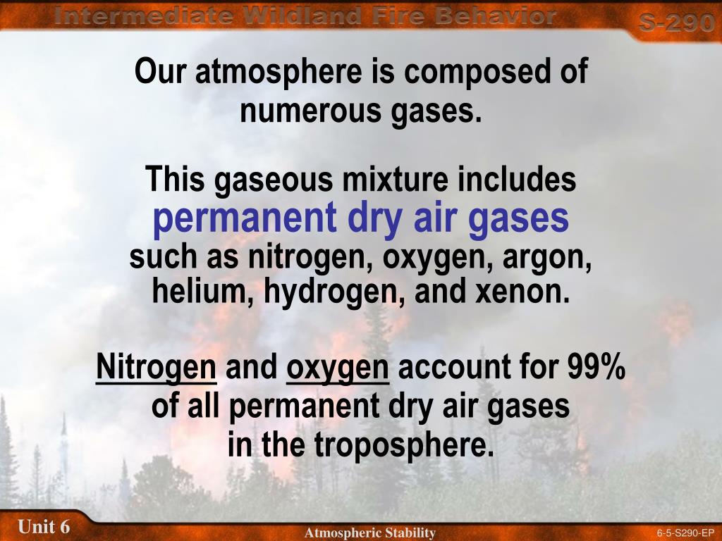 Unit 6 Objectives • Describe the relationship among atmospheric • pressure, temperature, density and volume. 2. Describe temperature lapse rate and stability, and the different temperature lapse rates used to determine the stability of the atmosphere. 3. Describe the effects of atmospheric stability on wildland fire behavior. 4. Name four types of temperature inversions and describe their influence on wildland fire behavior, including the thermal belt.