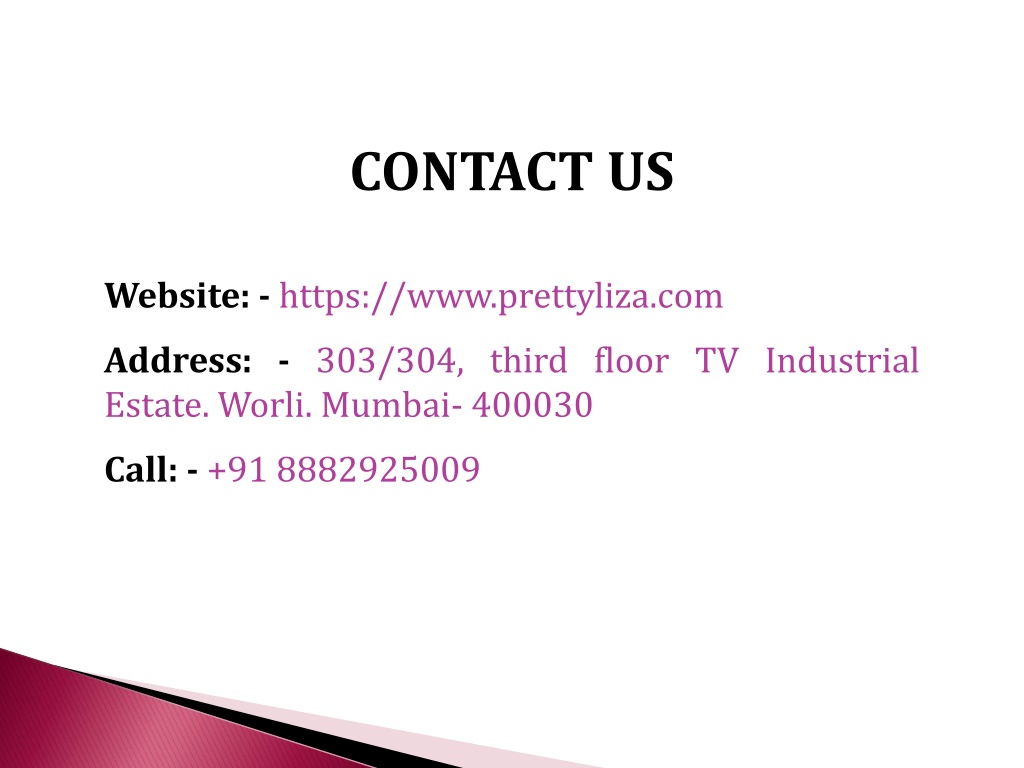 CONTACT US • Website: - https://www.prettyliza.com • Address: - 303/304, third floor TV Industrial Estate. Worli. Mumbai- 400030 • Call: - +91 8882925009
