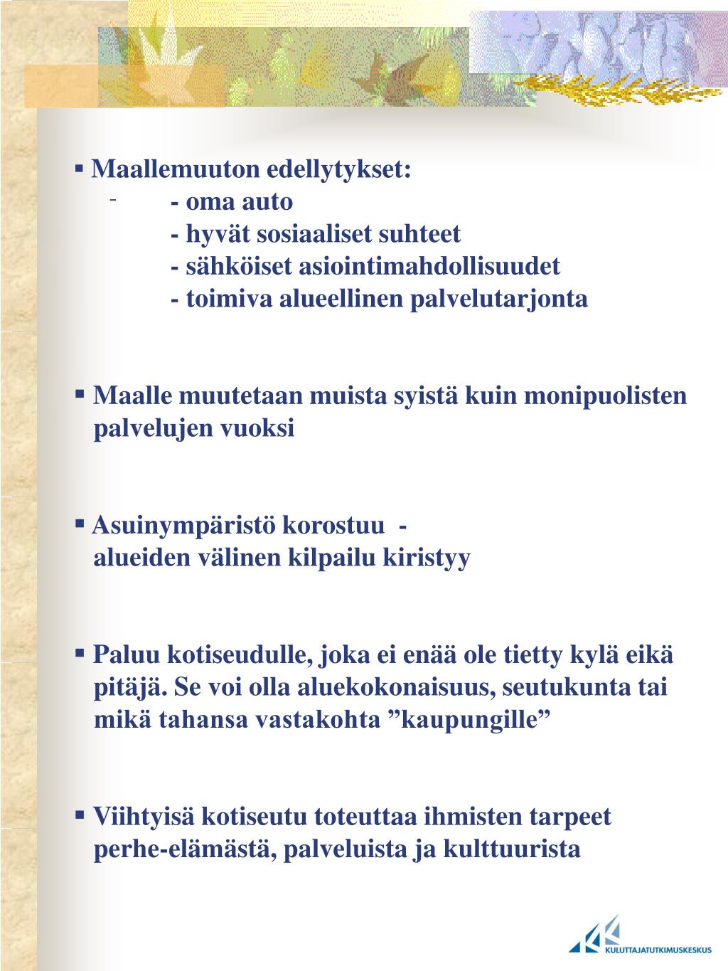 Maallemuuton edellytykset: - oma auto - hyvät sosiaaliset suhteet - sähköiset asiointimahdollisuudet - toimiva alueellinen palvelutarjonta • Maalle muutetaan muista syistä kuin monipuolisten palvelujen vuoksi • Asuinympäristö korostuu - alueiden välinen kilpailu kiristyy • Paluu kotiseudulle, joka ei enää ole tietty kylä eikä pitäjä. Se voi olla aluekokonaisuus, seutukunta tai mikä tahansa vastakohta ”kaupungille” • Viihtyisä kotiseutu toteuttaa ihmisten tarpeet perhe-elämästä, palveluista ja kulttuurista -