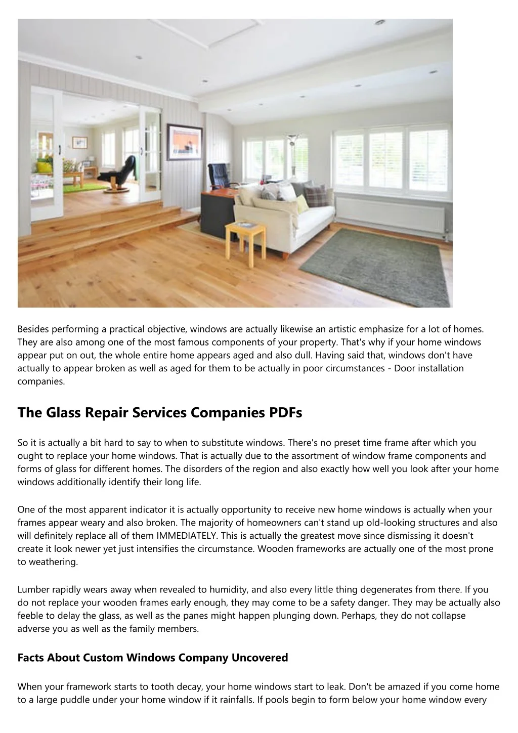 Besides performing a practical objective, windows are actually likewise an artistic emphasize for a lot of homes. They are also among one of the most famous components of your property. That's why if your home windows appear put on out, the whole entire home appears aged and also dull. Having said that, windows don't have actually to appear broken as well as aged for them to be actually in poor circumstances - Door installation companies. The Glass Repair Services Companies PDFs So it is actually a bit hard to say to when to substitute windows. There's no preset time frame after which you ought to replace your home windows. That is actually due to the assortment of window frame components and forms of glass for different homes. The disorders of the region and also exactly how well you look after your home windows additionally identify their long life. One of the most apparent indicator it is actually opportunity to receive new home windows is actually when your frames appear weary and also broken. The majority of homeowners can't stand up old-looking structures and also will definitely replace all of them IMMEDIATELY. This is actually the greatest move since dismissing it doesn't create it look newer yet just intensifies the circumstance. Wooden frameworks are actually one of the most prone to weathering. Lumber rapidly wears away when revealed to humidity, and also every little thing degenerates from there. If you do not replace your wooden frames early enough, they may come to be a safety danger. They may be actually also feeble to delay the glass, as well as the panes might happen plunging down. Perhaps, they do not collapse adverse you as well as the family members. Facts About Custom Windows Company Uncovered When your framework starts to tooth decay, your home windows start to leak. Don't be amazed if you come home to a large puddle under your home window if it rainfalls. If pools begin to form below your home window every