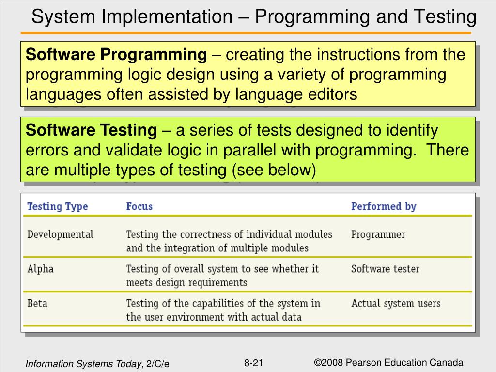 System Implementation – Programming and Testing Software Programming – creating the instructions from the programming logic design using a variety of programming languages often assisted by language editors Software Testing – a series of tests designed to identify errors and validate logic in parallel with programming. There are multiple types of testing (see below)