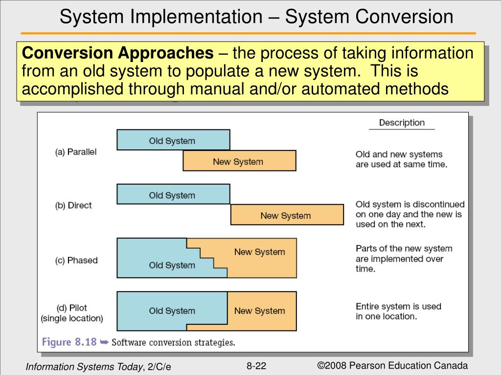 System Implementation – System Conversion Conversion Approaches – the process of taking information from an old system to populate a new system. This is accomplished through manual and/or automated methods