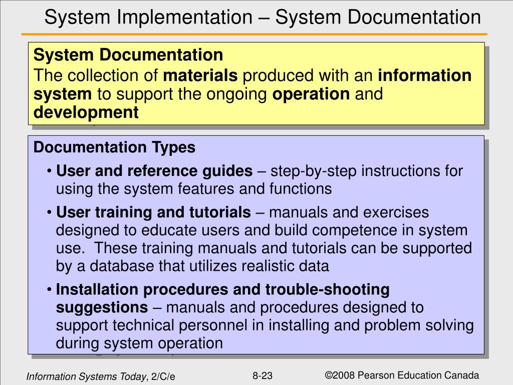 System Implementation – System Documentation System Documentation The collection of materials produced with an information system to support the ongoing operation and development • Documentation Types • User and reference guides – step-by-step instructions for using the system features and functions • User training and tutorials – manuals and exercises designed to educate users and build competence in system use. These training manuals and tutorials can be supported by a database that utilizes realistic data • Installation procedures and trouble-shooting suggestions – manuals and procedures designed to support technical personnel in installing and problem solving during system operation