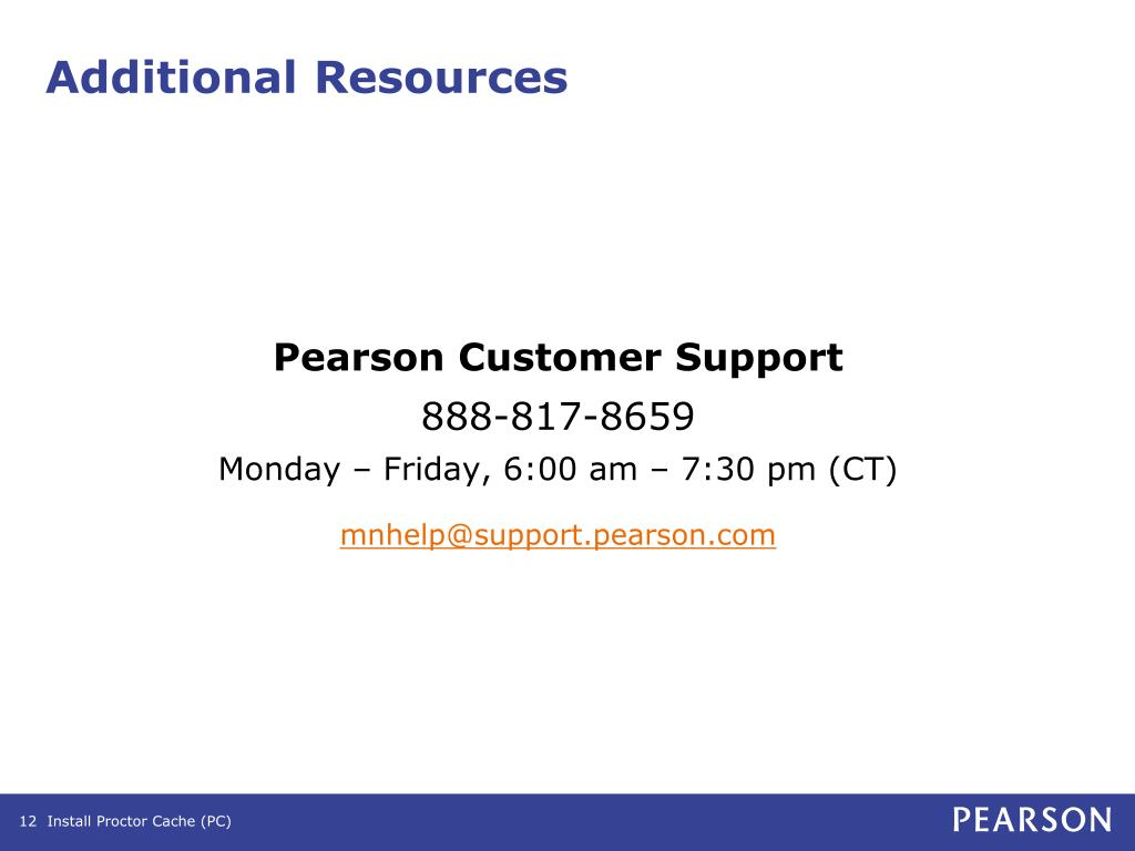 Additional Resources Pearson Customer Support 888-817-8659 • Monday – Friday, 6:00 am – 7:30 pm (CT) mnhelp@support.pearson.com 40% tint R175 G180 B213 50% tint R154 G161 B202 60% tint R134 G142 B191 70% tint R114 G123 B181 80% tint R94 G105 B170 90% tint R74 G86 B160 Blue R54 G67 B149 Install Proctor Cache (PC)
