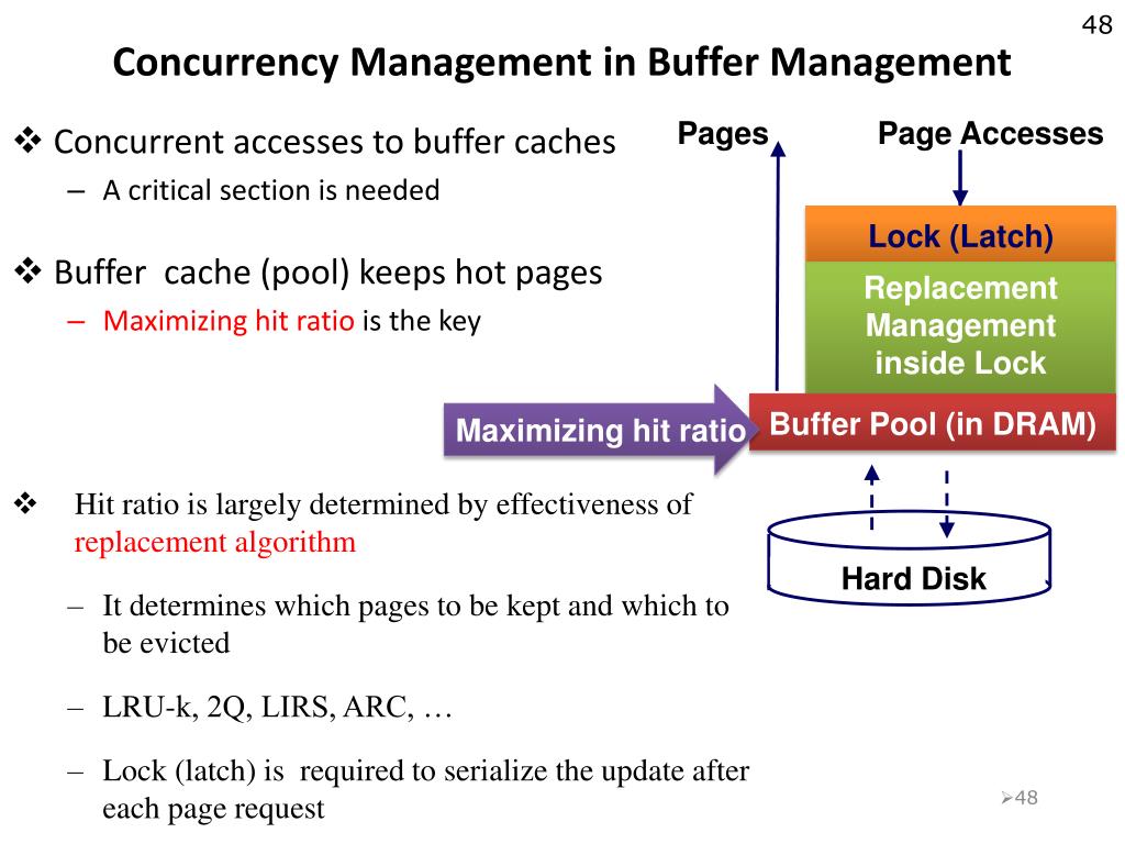 Concurrency Management in Buffer Management 48 Pages Page Accesses • Concurrent accesses to buffer caches • A critical section is needed • Buffer cache (pool) keeps hot pages • Maximizing hit ratio is the key Lock (Latch) Replacement Management inside Lock Maximizing hit ratio Buffer Pool (in DRAM) • Hit ratio is largely determined by effectiveness of replacement algorithm • It determines which pages to be kept and which to be evicted • LRU-k, 2Q, LIRS, ARC, … • Lock (latch) is required to serialize the update after each page request Hard Disk