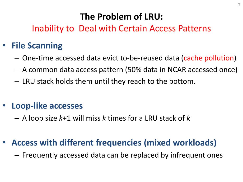 What is the major flaw? • The assumption of “recently used will be reused” is not always right • This prediction is based on a simple metrics of “recency” • Some are cached too long, some are evicted too early. Why it is so widely used? • Works well for data accesses following LRU assumption • A simple data structure to implement Why Flawed LRU is so Powerful in Practice