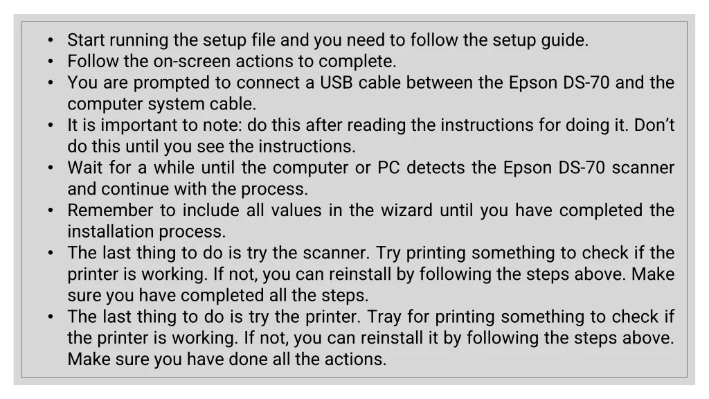 • Start running the setup file and you need to follow the setup guide. • Follow the on-screen actions to complete. • You are prompted to connect a USB cable between the Epson DS-70 and the computer system cable. • It is important to note: do this after reading the instructions for doing it. Don’t do this until you see the instructions. • Wait for a while until the computer or PC detects the Epson DS-70 scanner and continue with the process. • Remember to include all values in the wizard until you have completed the installation process. • The last thing to do is try the scanner. Try printing something to check if the printer is working. If not, you can reinstall by following the steps above. Make sure you have completed all the steps. • The last thing to do is try the printer. Tray for printing something to check if the printer is working. If not, you can reinstall it by following the steps above. Make sure you have done all the actions.
