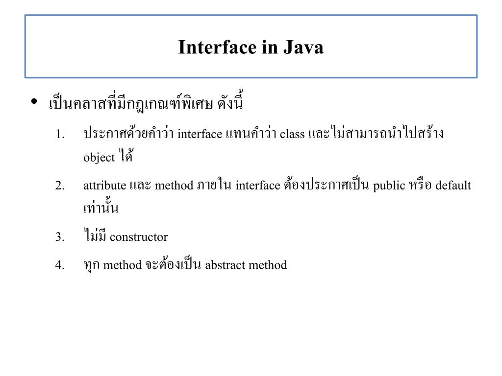 Interface in Java • เป็นคลาสที่มีกฎเกณฑ์พิเศษ ดังนี้ • ประกาศด้วยคำว่า interface แทนคำว่า class และไม่สามารถนำไปสร้าง object ได้ • attribute และ method ภายใน interface ต้องประกาศเป็น public หรือ default เท่านั้น • ไม่มี constructor • ทุก method จะต้องเป็น abstract method