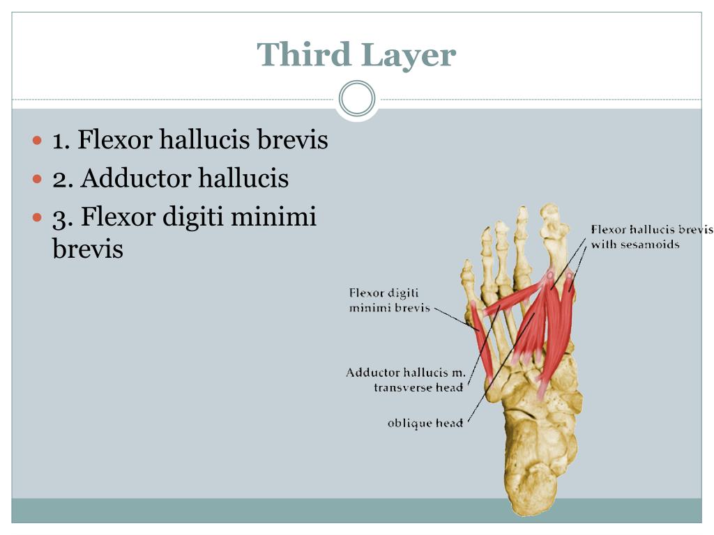 Third Layer 1. Flexor hallucisbrevis 2. Adductor hallucis 3. Flexor digitiminimibrevis