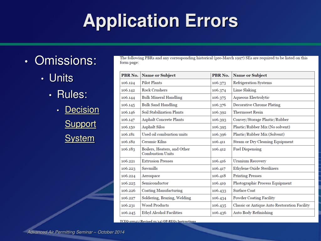 Application Errors • Omissions: • Units • Rules: • Decision Support System Advanced Air Permitting Seminar – October 2014