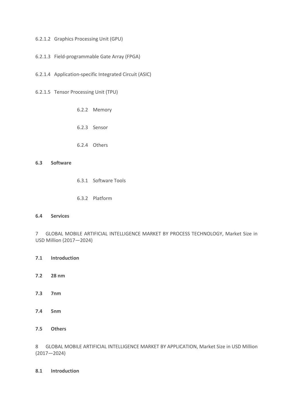 6.2.1.2 Graphics Processing Unit (GPU) 6.2.1.3 Field-programmable Gate Array (FPGA) 6.2.1.4 Application-specific Integrated Circuit (ASIC) 6.2.1.5 Tensor Processing Unit (TPU) 6.2.2 Memory 6.2.3 Sensor 6.2.4 Others 6.3 Software 6.3.1 Software Tools 6.3.2 Platform 6.4 Services 7 GLOBAL MOBILE ARTIFICIAL INTELLIGENCE MARKET BY PROCESS TECHNOLOGY, Market Size in USD Million (2017—2024) 7.1 Introduction 7.2 28 nm 7.3 7nm 7.4 5nm 7.5 Others 8 GLOBAL MOBILE ARTIFICIAL INTELLIGENCE MARKET BY APPLICATION, Market Size in USD Million (2017—2024) 8.1 Introduction