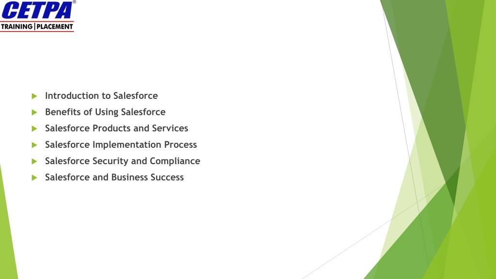 Introduction to Salesforce • Benefits of Using Salesforce • Salesforce Products and Services • Salesforce Implementation Process • Salesforce Security and Compliance • Salesforce and Business Success
