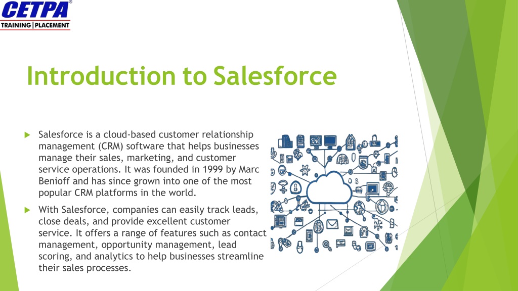 IntroductiontoSalesforce • Salesforce is a cloud-based customer relationship management (CRM) software that helps businesses manage their sales, marketing, and customer service operations. It was founded in 1999 by Marc Benioff and has since grown into one of the most popular CRM platforms in the world. • With Salesforce, companies can easily track leads, close deals, and provide excellent customer service. It offers a range of features such as contact management, opportunity management, lead scoring, and analytics to help businesses streamline their sales processes.