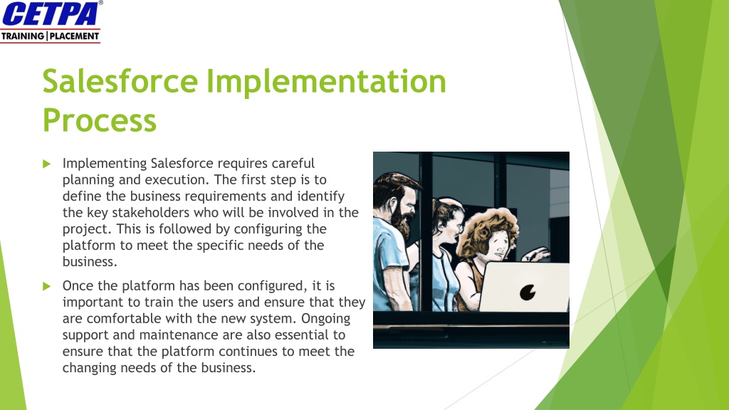 SalesforceImplementationProcess • Implementing Salesforce requires careful planning and execution. The first step is to define the business requirements and identify the key stakeholders who will be involved in the project. This is followed by configuring the platform to meet the specific needs of the business. • Once the platform has been configured, it is important to train the users and ensure that they are comfortable with the new system. Ongoing support and maintenance are also essential to ensure that the platform continues to meet the changing needs of the business.