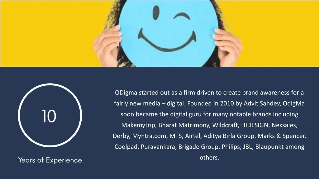 ODigma started out as a firm driven to create brand awareness for a fairly new media – digital. Founded in 2010 by AdvitSahdev, OdigMa soon became the digital guru for many notable brands including Makemytrip, Bharat Matrimony, Wildcraft, HIDESIGN, Nexsales, Derby, Myntra.com, MTS, Airtel, Aditya Birla Group, Marks & Spencer, Coolpad, Puravankara, Brigade Group, Philips, JBL, Blaupunkt among others. 10 Years of Experience