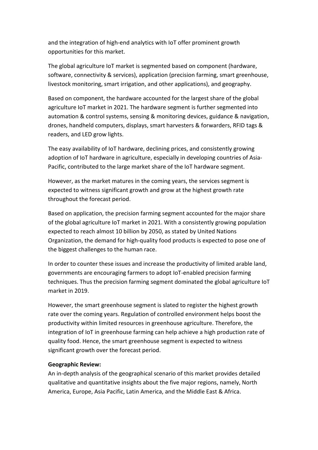 and the integration of high-end analytics with IoT offer prominent growth opportunities for this market. The global agriculture IoT market is segmented based on component (hardware, software, connectivity & services), application (precision farming, smart greenhouse, livestock monitoring, smart irrigation, and other applications), and geography. Based on component, the hardware accounted for the largest share of the global agriculture IoT market in 2021. The hardware segment is further segmented into automation & control systems, sensing & monitoring devices, guidance & navigation, drones, handheld computers, displays, smart harvesters & forwarders, RFID tags & readers, and LED grow lights. The easy availability of IoT hardware, declining prices, and consistently growing adoption of IoT hardware in agriculture, especially in developing countries of Asia- Pacific, contributed to the large market share of the IoT hardware segment. However, as the market matures in the coming years, the services segment is expected to witness significant growth and grow at the highest growth rate throughout the forecast period. Based on application, the precision farming segment accounted for the major share of the global agriculture IoT market in 2021. With a consistently growing population expected to reach almost 10 billion by 2050, as stated by United Nations Organization, the demand for high-quality food products is expected to pose one of the biggest challenges to the human race. In order to counter these issues and increase the productivity of limited arable land, governments are encouraging farmers to adopt IoT-enabled precision farming techniques. Thus the precision farming segment dominated the global agriculture IoT market in 2019. However, the smart greenhouse segment is slated to register the highest growth rate over the coming years. Regulation of controlled environment helps boost the productivity within limited resources in greenhouse agriculture. Therefore, the integration of IoT in greenhouse farming can help achieve a high production rate of quality food. Hence, the smart greenhouse segment is expected to witness significant growth over the forecast period. Geographic Review: An in-depth analysis of the geographical scenario of this market provides detailed qualitative and quantitative insights about the five major regions, namely, North America, Europe, Asia Pacific, Latin America, and the Middle East & Africa.