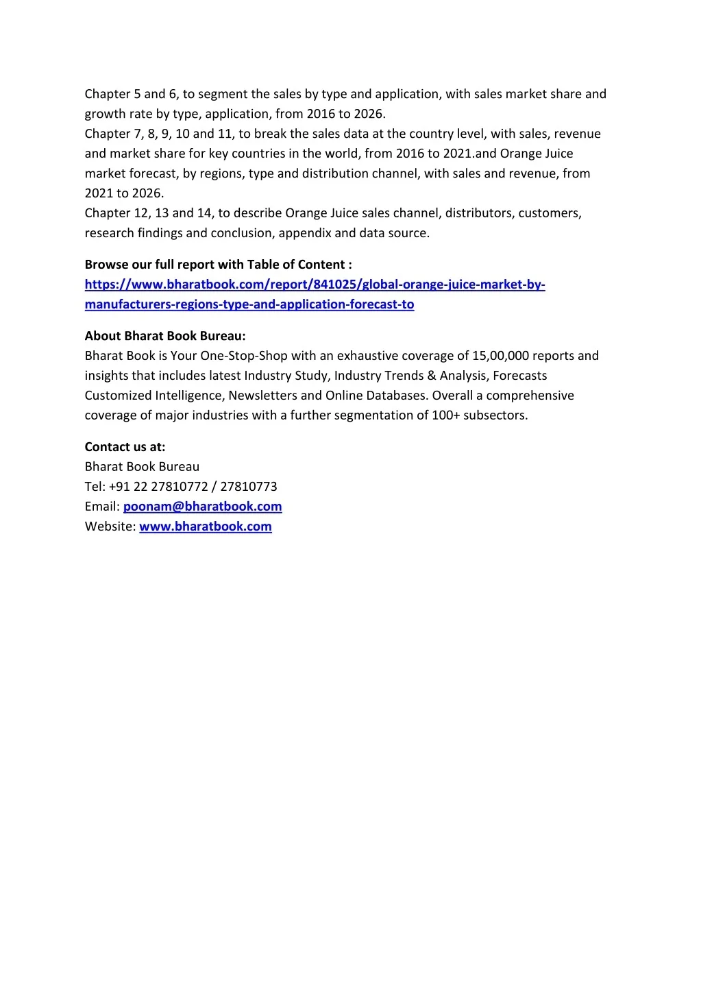 Chapter 5 and 6, to segment the sales by type and application, with sales market share and growth rate by type, application, from 2016 to 2026. Chapter 7, 8, 9, 10 and 11, to break the sales data at the country level, with sales, revenue and market share for key countries in the world, from 2016 to 2021.and Orange Juice market forecast, by regions, type and distribution channel, with sales and revenue, from 2021 to 2026. Chapter 12, 13 and 14, to describe Orange Juice sales channel, distributors, customers, research findings and conclusion, appendix and data source. Browse our full report with Table of Content : https://www.bharatbook.com/report/841025/global-orange-juice-market-by- manufacturers-regions-type-and-application-forecast-to About Bharat Book Bureau: Bharat Book is Your One-Stop-Shop with an exhaustive coverage of 15,00,000 reports and insights that includes latest Industry Study, Industry Trends & Analysis, Forecasts Customized Intelligence, Newsletters and Online Databases. Overall a comprehensive coverage of major industries with a further segmentation of 100+ subsectors. Contact us at: Bharat Book Bureau Tel: +91 22 27810772 / 27810773 Email: poonam@bharatbook.com Website: www.bharatbook.com