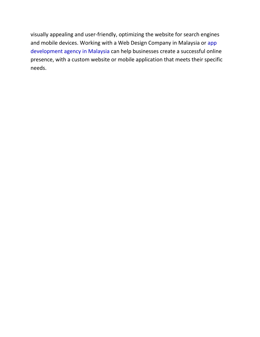 visually appealing and user-friendly, optimizing the website for search engines and mobile devices. Working with a Web Design Company in Malaysia or app development agency in Malaysia can help businesses create a successful online presence, with a custom website or mobile application that meets their specific needs.