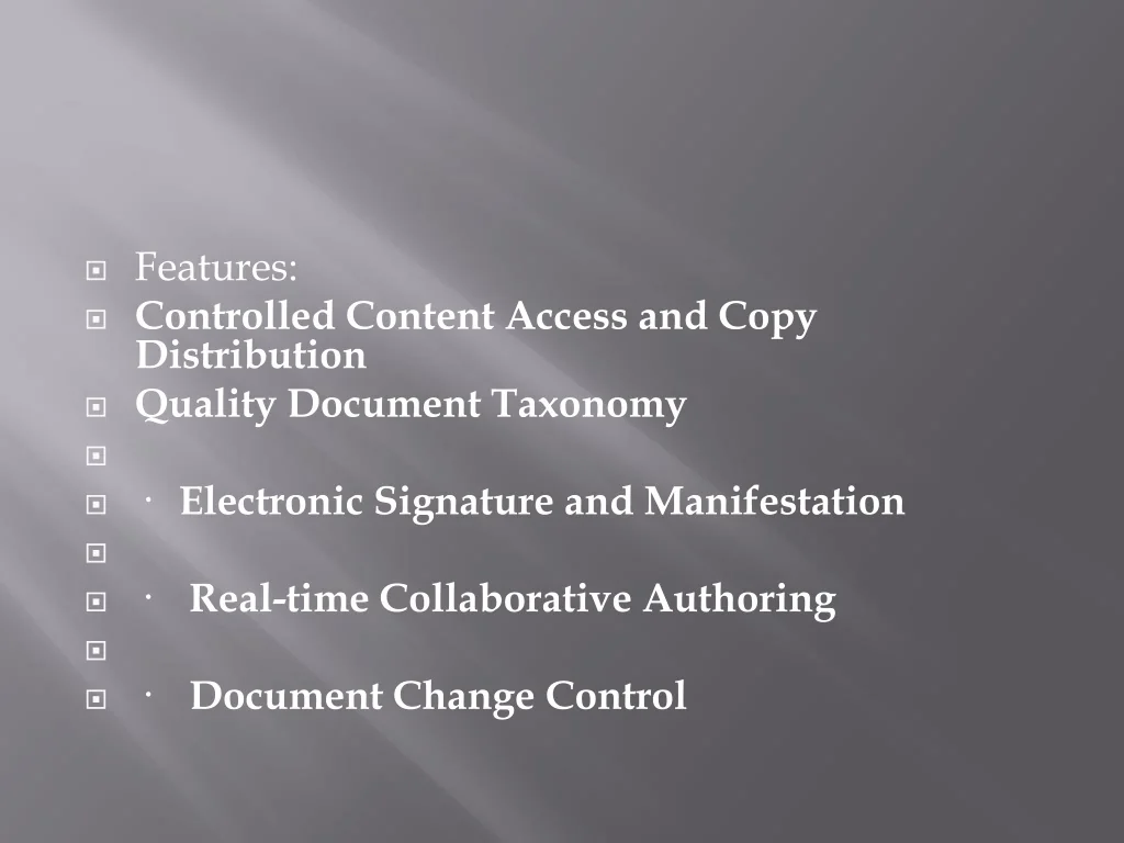Features: • Controlled Content Access and Copy Distribution • Quality Document Taxonomy • · Electronic Signature and Manifestation • · Real-time Collaborative Authoring • · Document Change Control