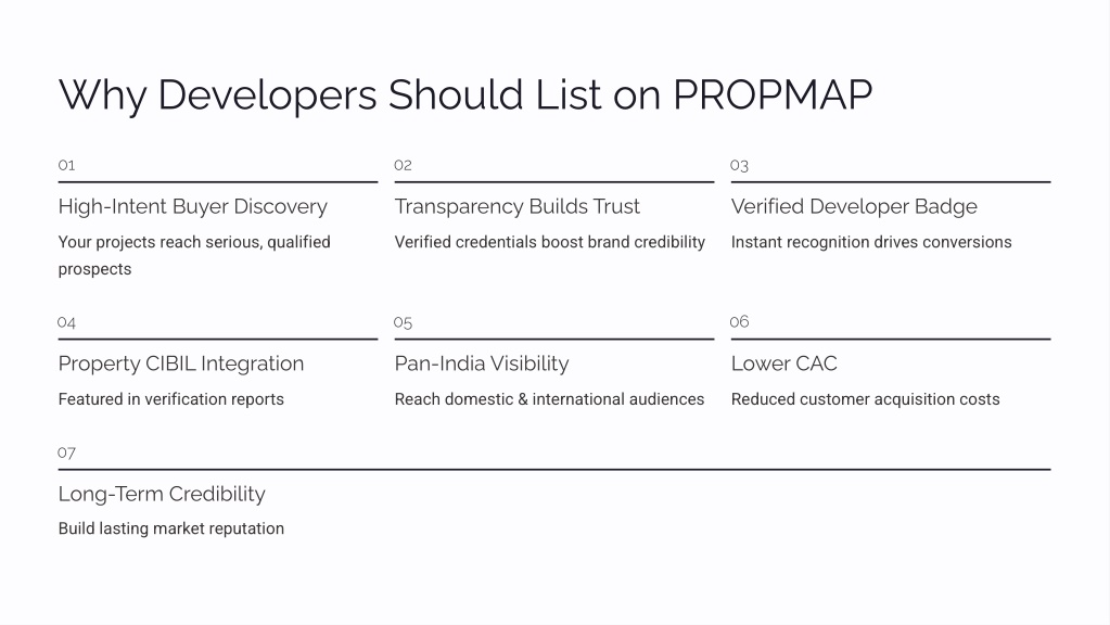 Why Developers Should List on PROPMAP 01 02 03 H-Iµøpµø BĀĞpä Dìc¾ėpäĞ TäaµìáaäpµcĞ BĀ«jì TäĀìø Vpäpj Dpėp«¾ápä Bajp Your projects reach serious, qualified prospects Verified credentials boost brand credibility Instant recognition drives conversions 04 05 06 Pä¾ápäøĞ CIBIL Iµøpäaø¾µ Paµ-Iµja Vìb«øĞ L¾Ępä CAC Featured in verification reports Reach domestic & international audiences Reduced customer acquisition costs 07 L¾µ-Tpä³ Cäpjb«øĞ Build lasting market reputation