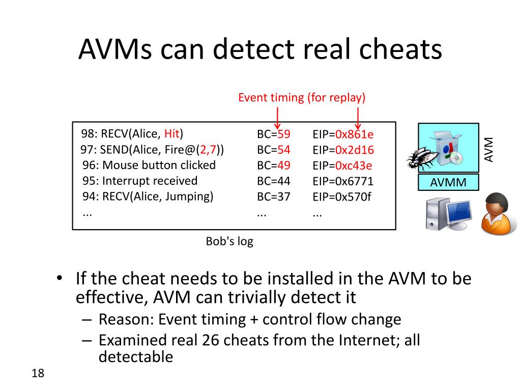 AVMs can detect real cheats Event timing (for replay) • If the cheat needs to be installed in the AVM to be effective, AVM can trivially detect it • Reason: Event timing + control flow change • Examined real 26 cheats from the Internet; all detectable 98: RECV(Alice, Hit) 98: RECV(Alice, Missed)97: SEND(Alice, Fire@(3,9))96: Mouse button clicked95: Interrupt received94: RECV(Alice, Jumping) ... BC=53BC=52BC=47BC=44BC=37... BC=59BC=54BC=49BC=44BC=37... EIP=0xb382EIP=0x3633EIP=0xc490EIP=0x6771EIP=0x570f... EIP=0x861eEIP=0x2d16EIP=0xc43eEIP=0x6771EIP=0x570f... AVM 97: SEND(Alice, Fire@(2,7)) AVMM Bob's log