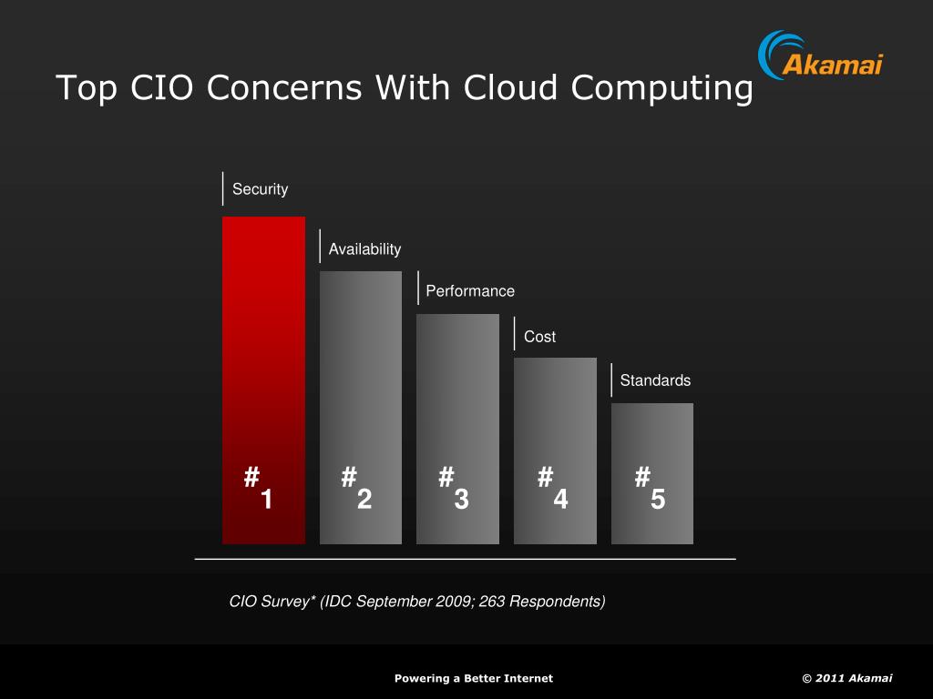 Top CIO Concerns With Cloud Computing Security Availability Performance Cost Standards #1 #2 #3 #4 #5 CIO Survey* (IDC September 2009; 263 Respondents)