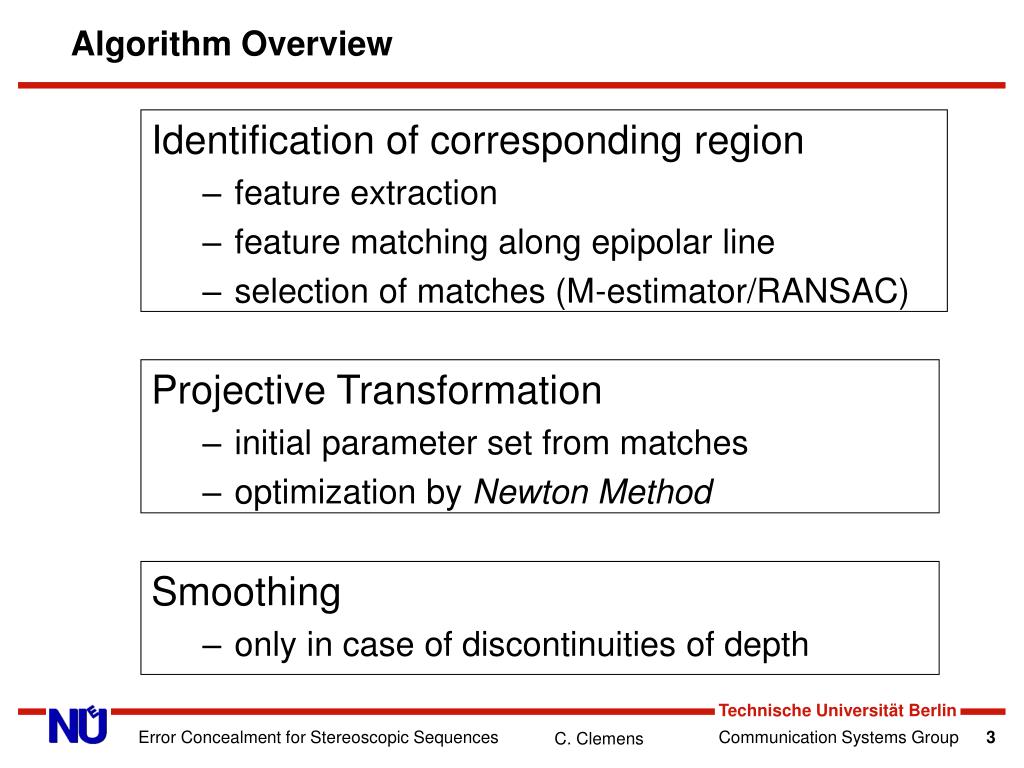 Algorithm Overview Identification of corresponding region • feature extraction • feature matching along epipolar line • selection of matches (M-estimator/RANSAC) Projective Transformation • initial parameter set from matches • optimization by Newton Method Smoothing • only in case of discontinuities of depth Error Concealment for Stereoscopic Sequences