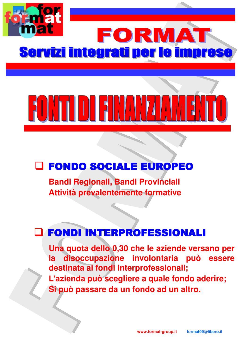 FORMAT Servizi integrati per le imprese FONTI DI FINANZIAMENTO FORMAT • FONDO SOCIALE EUROPEO Bandi Regionali, Bandi Provinciali Attività prevalentemente formative • FONDI INTERPROFESSIONALI Una quota dello 0,30 che le aziende versano per la disoccupazione involontaria può essere destinata ai fondi interprofessionali; L’azienda può scegliere a quale fondo aderire; Si può passare da un fondo ad un altro. www.format-group.it format09@libero.it