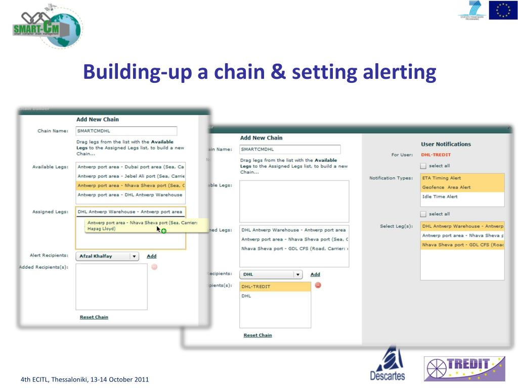 SMART-CM Value Added Services • SMART-CM developed VAS include: • ETA: updates on initial ETA based on the actual location received by CSD and comparing against initial plan • Geo-fencing: radius or polygon based either on nodal points (e.g. port) or intermediate waypoints and check for container entering/exiting geo-fenced area • Flags/Warnings: Critical alerts e.g. when a container has exceeded time thresholds in predefined zones